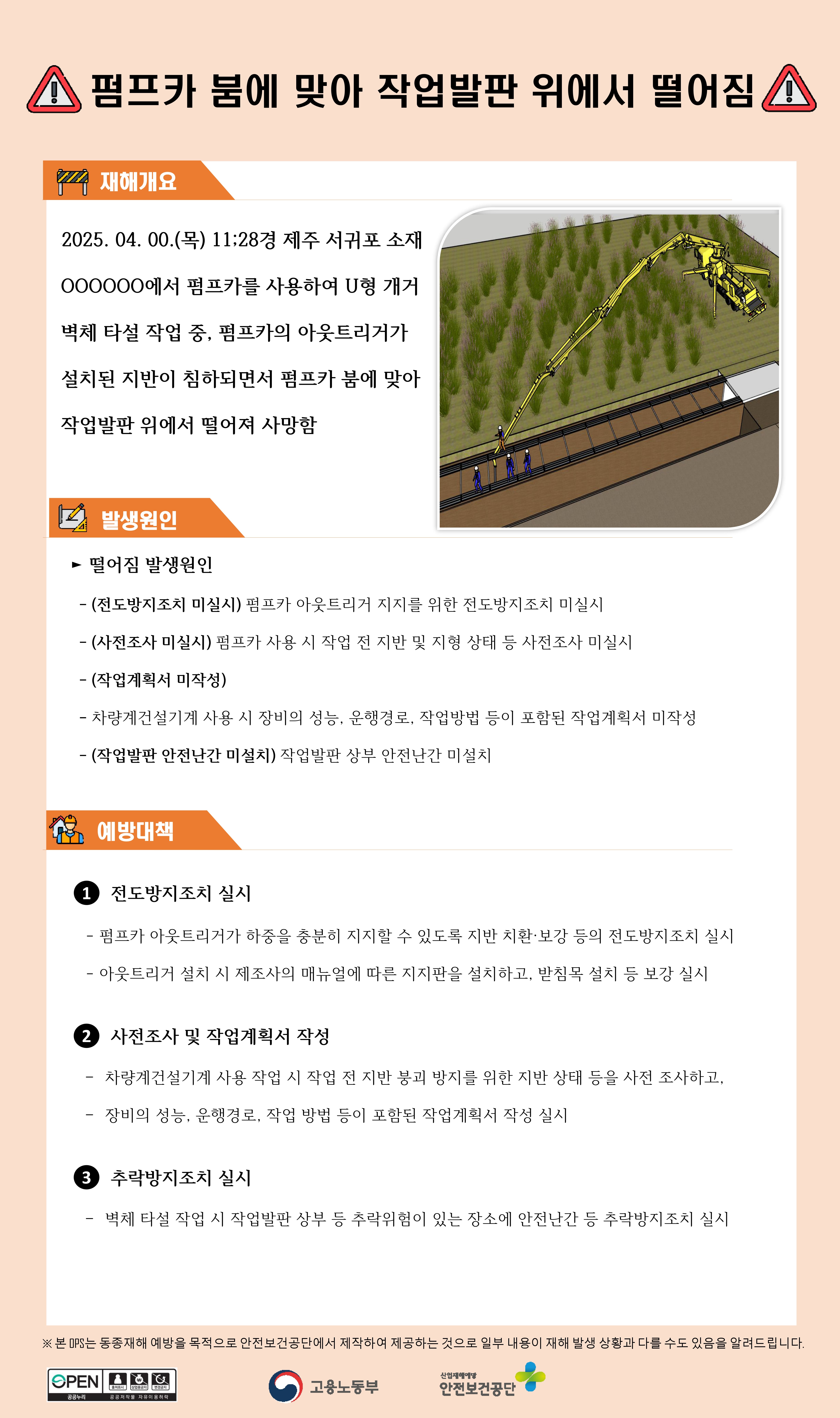 건설업 재해사례 - 펌프카 붐대에 맞아 작업발판 위에 떨어짐