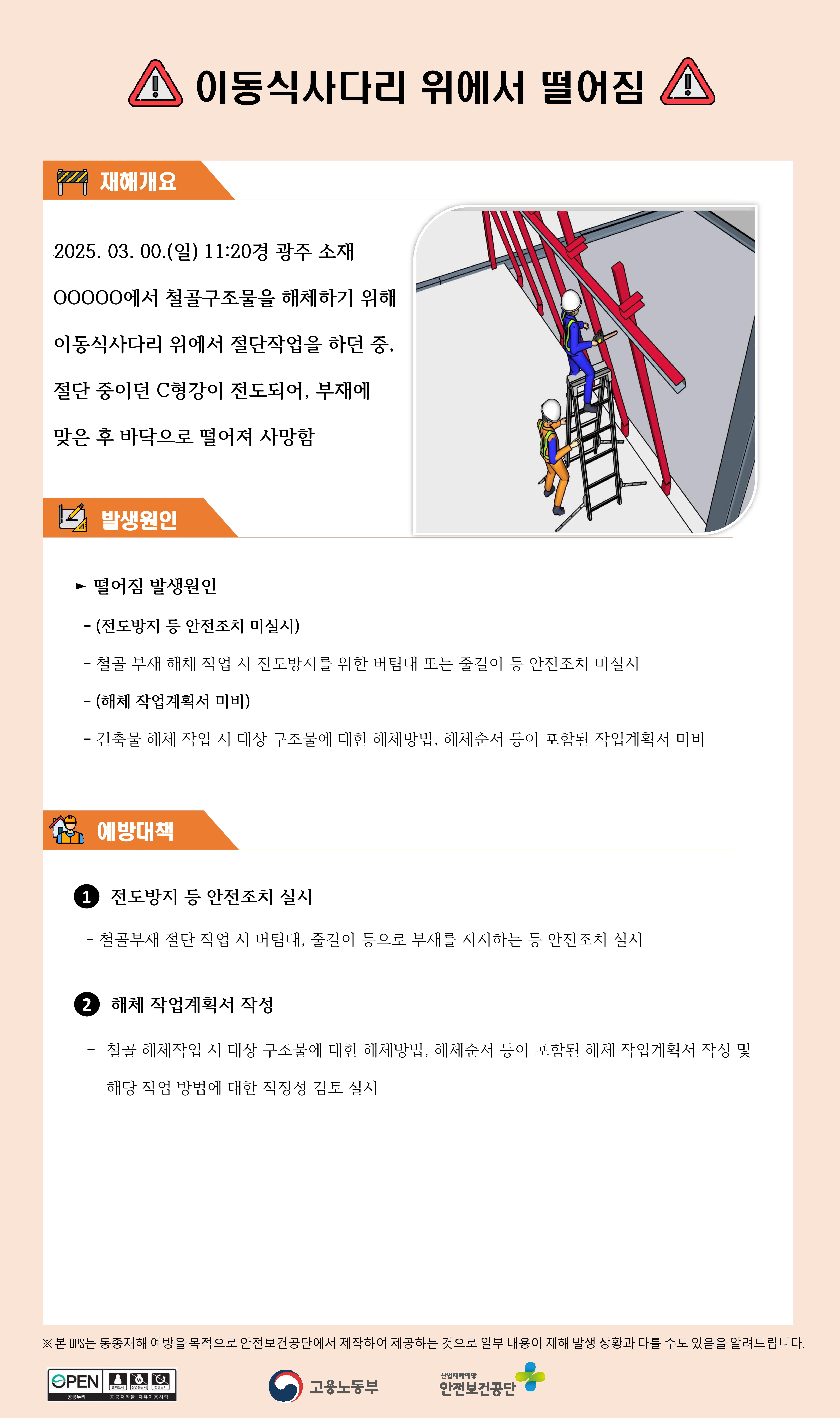 건설업 재해사례 - 이동식 사다리 위에서 떨어짐
