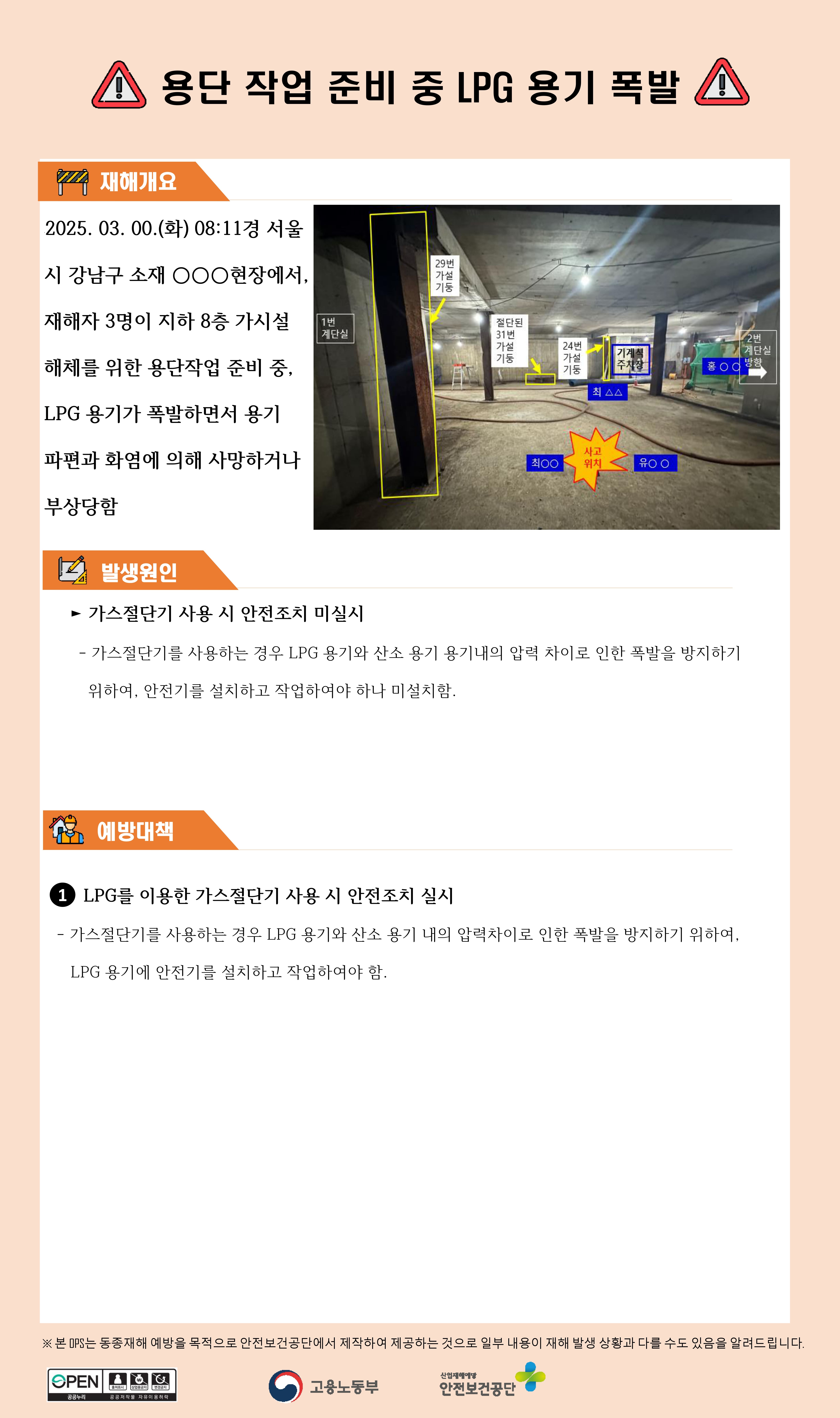 건설업 재해사례 - 용단 작업 준비 중 LPG 용기 폭발