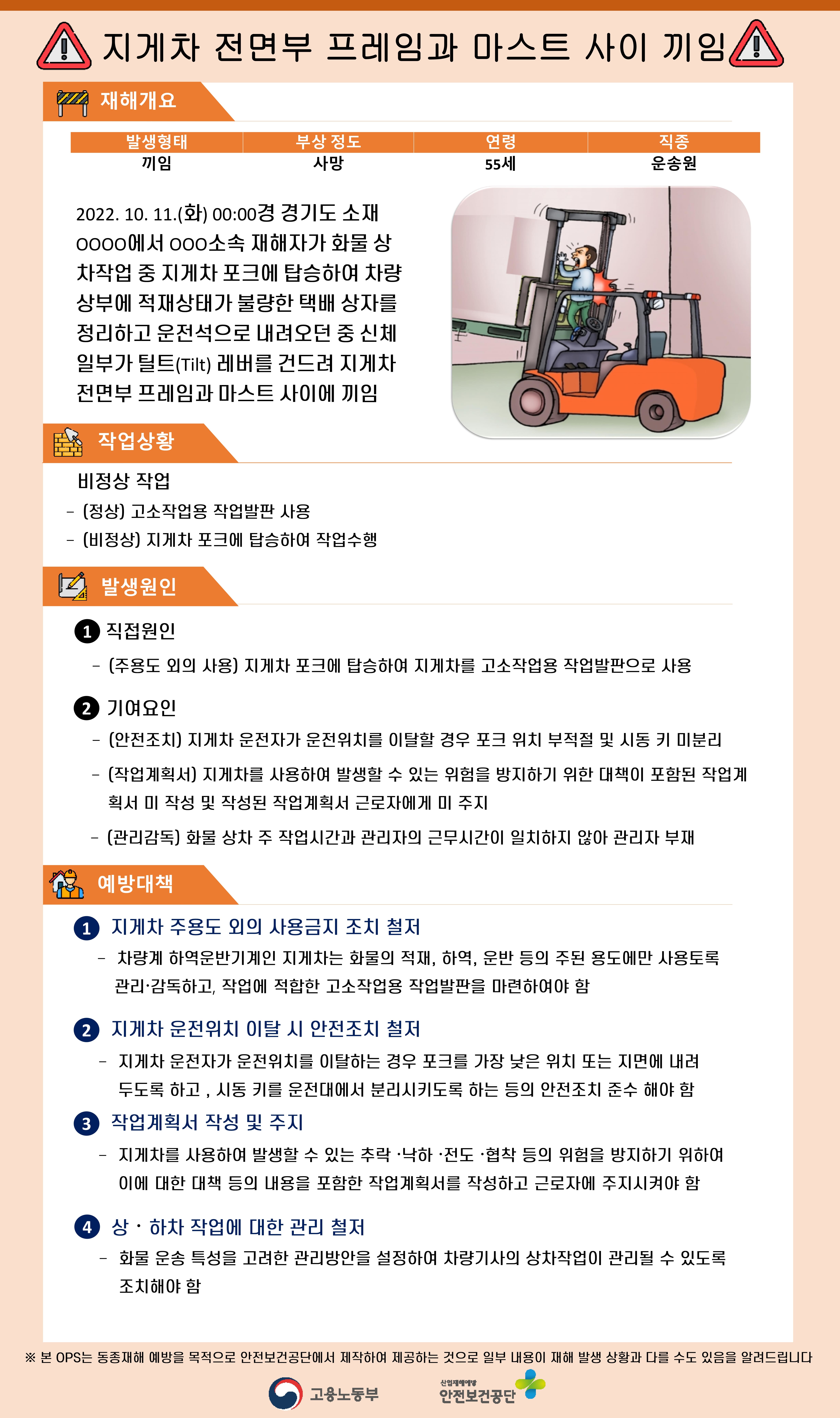 서비스업 재해사례 - 지게차 전면부 프레임과 마스트 사이 끼임
