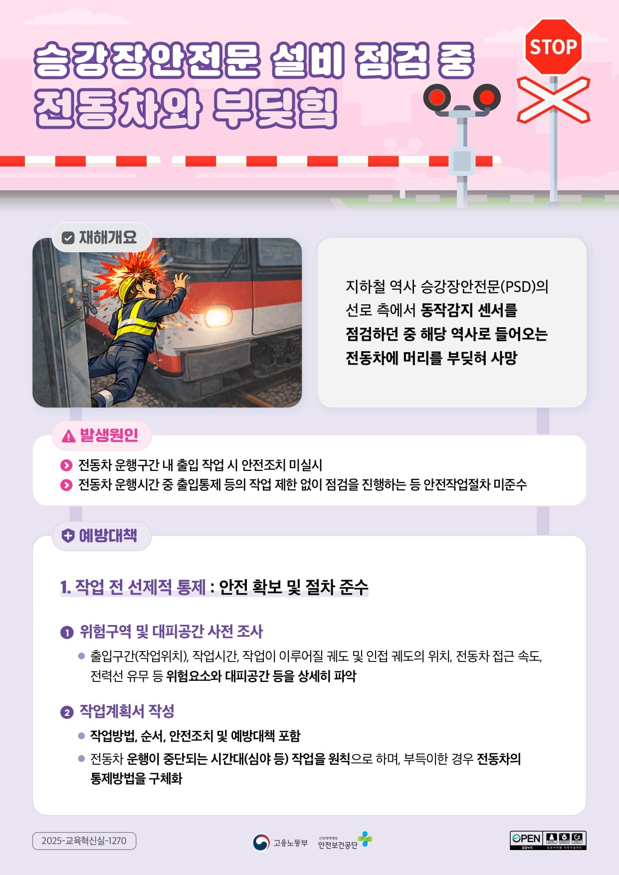 철도운송 재해사례 - 승강기안전문 설비 점검 중 전동차와 부딪힘
