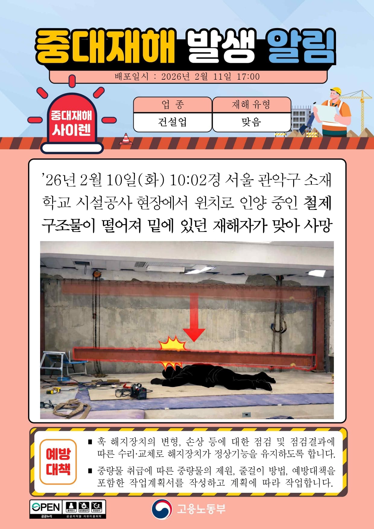 중대재해 발생 알림(맞음) - 건설업